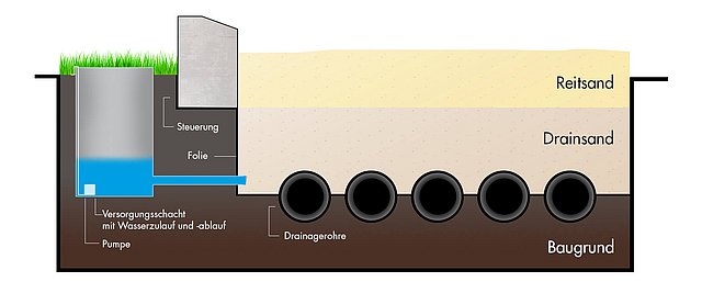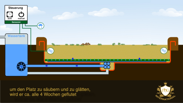 AquaFlow ist ein neu entwickeltes Unterflur Bewässerungs-System für Reitplätze - mit integriertem unterirdischem Wasserspeicher.