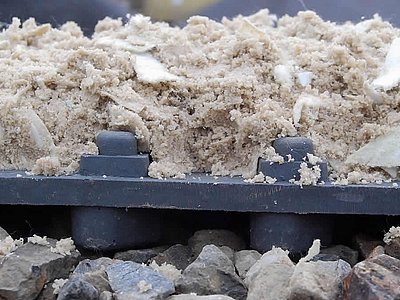 Auf die Reitplatzmatten kommt die ausgewählte Sand-Tretschicht in Höhe von ca. 8-12 cm, die optimaler weise mit innoReit-tex® Vlies/Faser-Geotextilien gemischt wird. Die Wasserrückhaltetassen der Lochmatte können mit einer gröberen Sandkörnung 1,0-1,5 mm verfüllt werden.