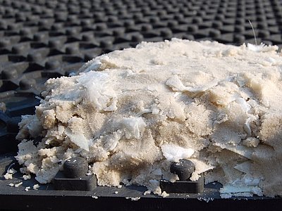 Bei der Hallenmatte wird auf der Oberseite der Matten durch gleichmäßig verteilte Noppen und den etwas tiefer liegenden Näpfen (dienen als Wasserspeicher) sichergestellt, dass die Tretschicht mit der Matte eine Verbindung eingeht.
