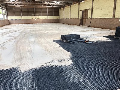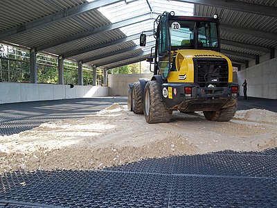 Die Hallenmatte aus PVC Recycling-Kunststoff ist aufgrund ihrer Materialbeschaffenheit sehr elastisch und Schock absorbierend. Der Aufprall federt besser ab, dadurch werden Gelenke und Sehnen der Pferde geschont.